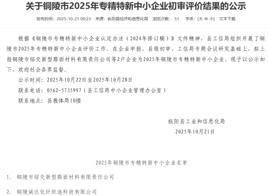 近日,樅陽縣工業(yè)和信息化局正式發(fā)布《關(guān)于銅陵市 2025年專精特新中小企業(yè)初審評(píng)價(jià)結(jié)果的公示》,綜交新型路面材料公司憑借在專業(yè)領(lǐng)域的技術(shù)積淀、創(chuàng)新能力及市場競爭力,歷經(jīng)企業(yè)自主申報(bào)、縣級(jí)部門初審、工信局專題會(huì)議研究等多環(huán)節(jié)嚴(yán)謹(jǐn)審核,成功入選初審名單,擬認(rèn)定為2025年銅陵市專精特新中小企業(yè)。